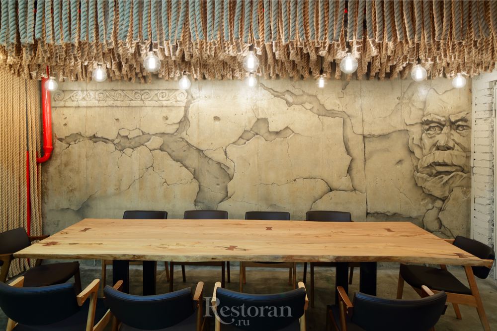 Интерьер: В «Косом Марксе» можно найти 200-килограммовое бревно из дуба под потолком, красные мосты, декоративный мох, стены из белого кирпича, «канатный» декор и обилие зелени. Бар занимает два этажа.