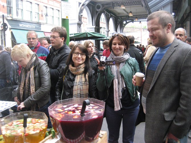 Между тем, дневная программа продолжилась на старом лондонском рынке Borough Market , в прогулке по которому участников стажировки сопровождал Том Вульф, личный повар Дженнифер Лопес. По его рекомендации студенты заглянули в кондитерскую лавку, где каждому из них на пробу была преподнесена капля органического сырого шоколада, а также посетили сырный магазин, где отведали знаменитой английской брынзы. Увенчалось знакомство с английским базаром дегустацией страусиного гамбургера и визитом в магазин экзотических пряностей, где мистер Вульф имеет обыкновение покупать специи из Мексики и Аргентины.