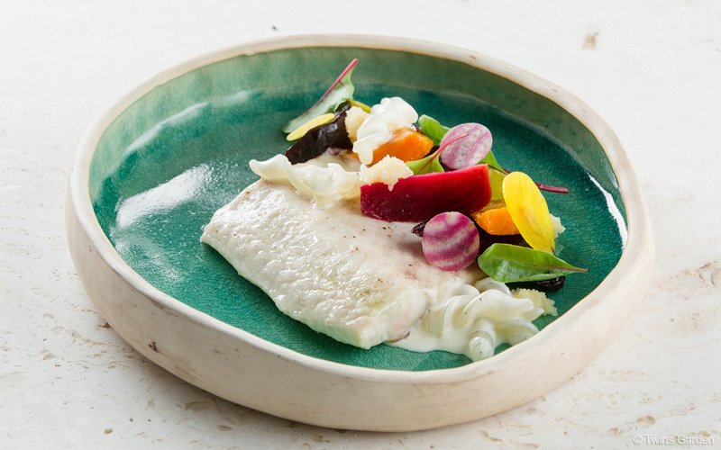 В меню Twins Garden около 40 позиций, среди которых — паштет из куриной печени со сладкими перцами, запеченные грибы с луком и «салом» из сельдерея, стерлядь со свеклой и «фузилли» из визиги, сет «Наши сыры» из коровьего и козьего молока.