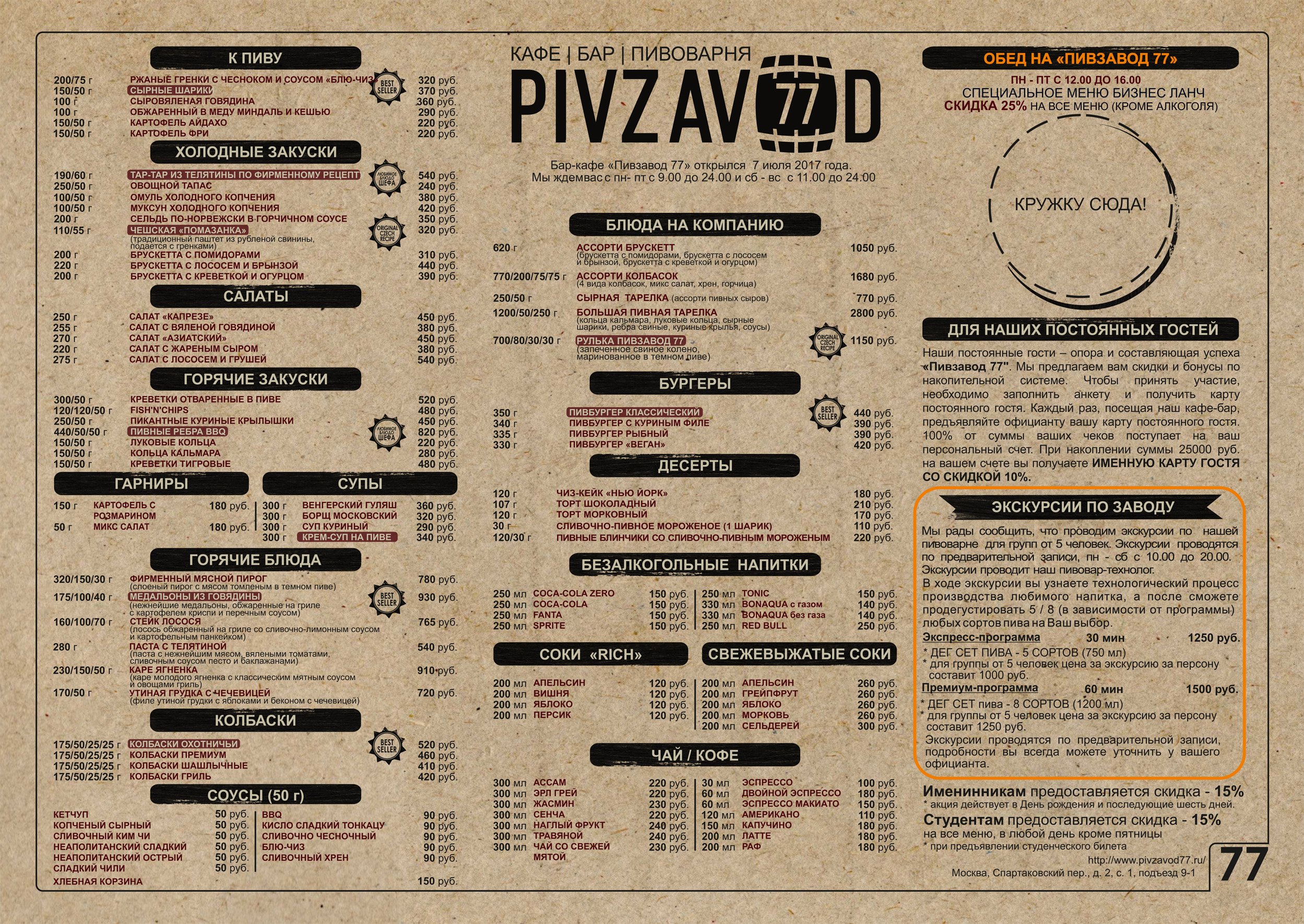 Требования следующие — блюда должны быть несложные, понятные, приготовленные из небольшого количества ингредиентов (оптимизацию затрат никто не отменял), но при этом — вкусные и с красивой, изобретательной подачей. Начинали мы с совсем небольшого меню, сейчас заметно расширились; понятно, что кухня у нас в основном пивная, среди хитов — несколько видов бургеров, колбаски, свиные ребра, тартар из телятины. Из закусок могу отметить сырные шарики, я знаю гостей, которые именно на них к нам ходят. Что касается цен, то цены мы стараемся держать демократичные, с 1 ноября, правда, слегка приподняли их, но, по моим ощущениям, гости наши на это особого внимания не обратили.