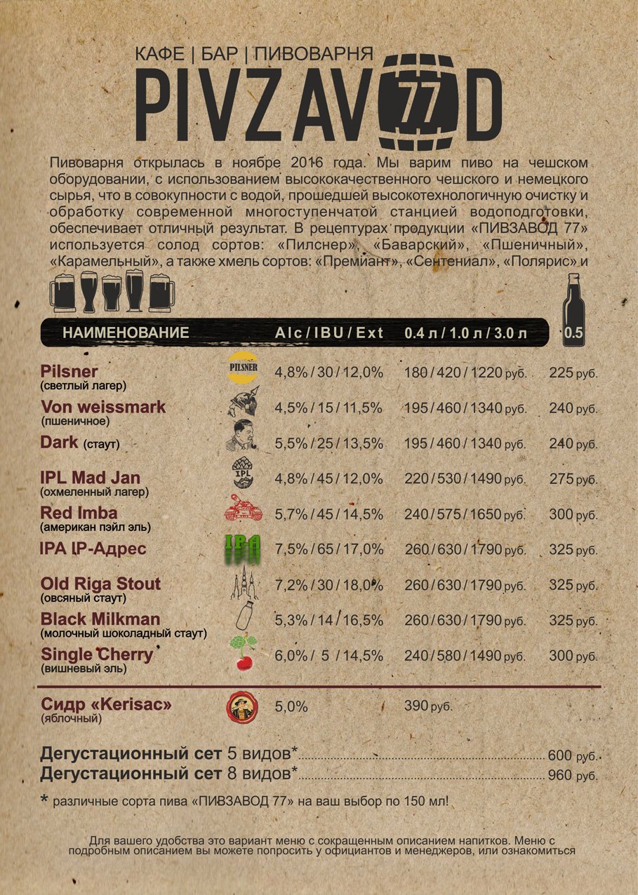 В стоимость экскурсий входят дегустации. А в те времена, когда у нас не было ресторана, помимо собственно возможности попробовать разные сорта, мы предоставляли экскурсантам возможность на 2 часа остаться в пивоварне после завершения экскурсии, и прямо здесь, на месте, выпить пива столько, сколько они захотят. Выставляли столики, разрешали заказывать закуски из соседних заведений — пиццу, и так далее. Сейчас такого, конечно, уже нет, зато есть другие предложения, предусмотренные нашей программой лояльности. Скажем, каждую среду с 20:00 мы бесплатно разливаем в баре одну кегу пива.