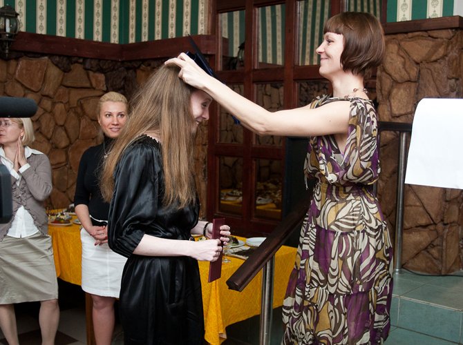 Происходящим по традиции заправляли руководитель специализации "Менеджмент в сфере интернет-технологий" Юлия Лесникова и бессменный куратор программы Соня Соколова, перед церемонией вручения представшие в шапочках-конфедератках. Такие же шапочки чуть позже примерили и все выпускники специализации, получив дипломы из рук людей, которые за последний год стали им едва ли не самыми близкими. Вечер продолжился тематическими конкурсами, проходившими в сопровождении специального сета, который отыграл Dj Slava Breath - к слову, слушатель специализации "Менеджмент в музыкальной индустрии".