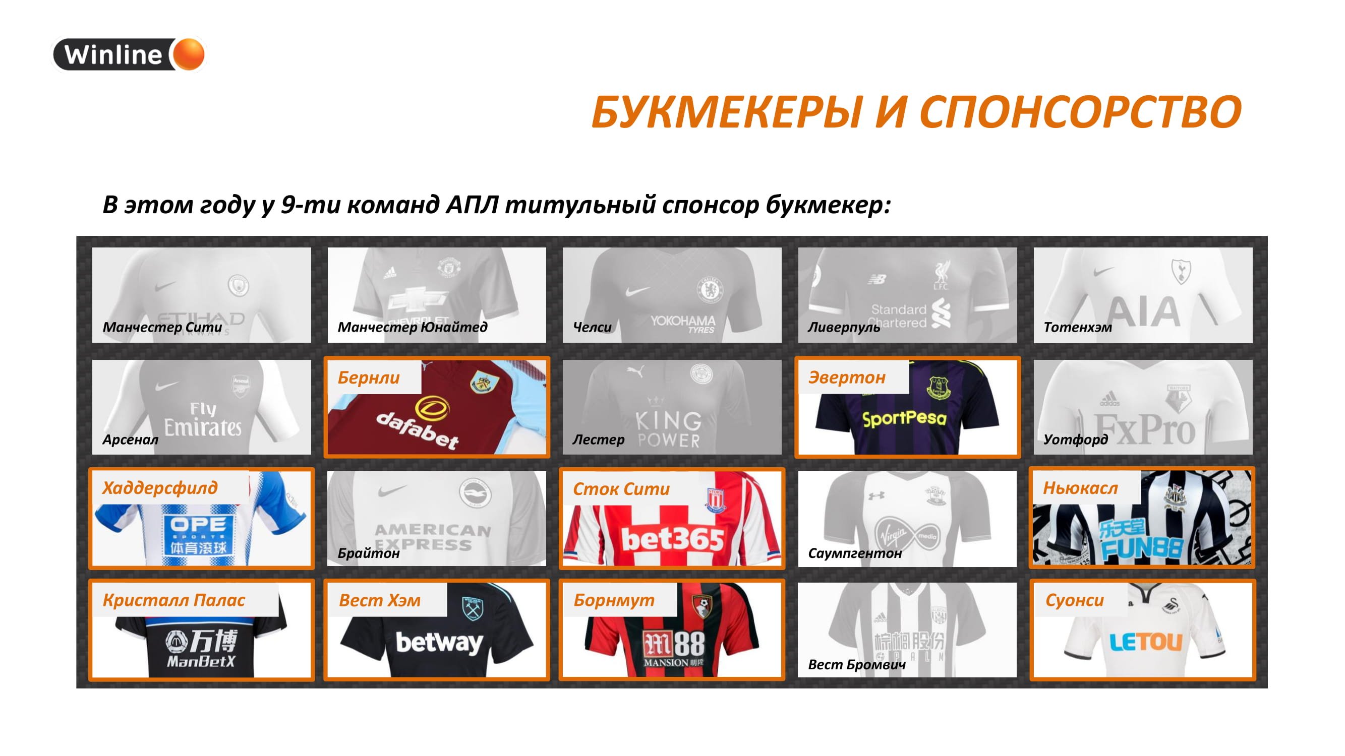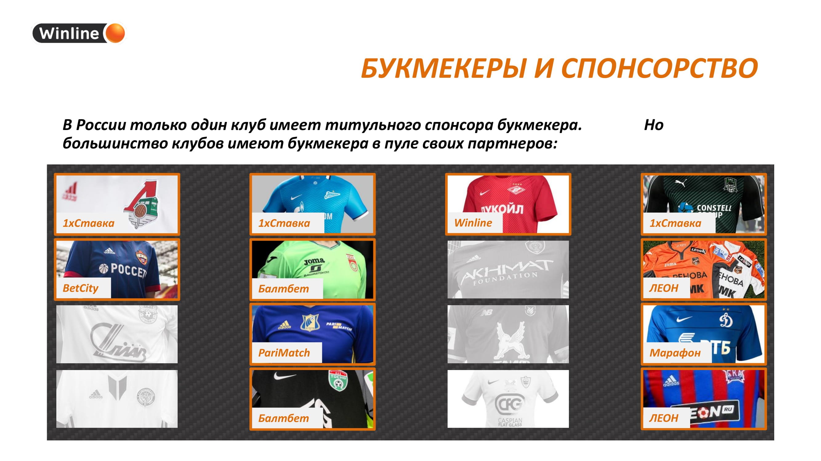В РФПЛ эта практика пока не так распространена — у нас на данный момент букмекера в качестве титульного спонсора привлек всего один клуб, хабаровский СКА. Тем не менее, большинство команд РФПЛ — 11 из шестнадцати — имеют букмекеров в пуле своих партнеров, причем размеры спонсорских выплат могут составлять в среднем от 200 тысяч до 2 миллионов долларов за сезон.