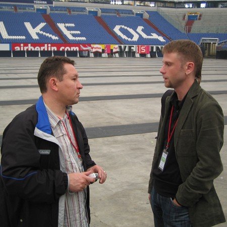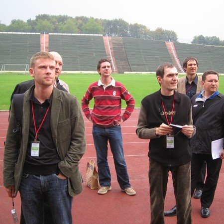 Как повезло нашей группе! Мы увидели то, о чем неоднократно слышали на лекциях и во время футбольно-финансовой конференции в Москве в сентябре 2005 года — Футбольный стадион без футбольного газона. Зеленое поле в дни «отдыха» вывозят по рельсам на площадь, служащую во время игровых дней паркингом для машин представителей СМИ. Вывоз поля на прогулку — удовольствие не из дешевых. Судите сами: «туда и обратно» стоит 15 000 евро. Если бы не проводимые в отсутствии футбольного ковра концерты и соревнования, например, по биатлону (!), дешевле было бы один раз в сезон менять покрытие. Как в Лужниках.
