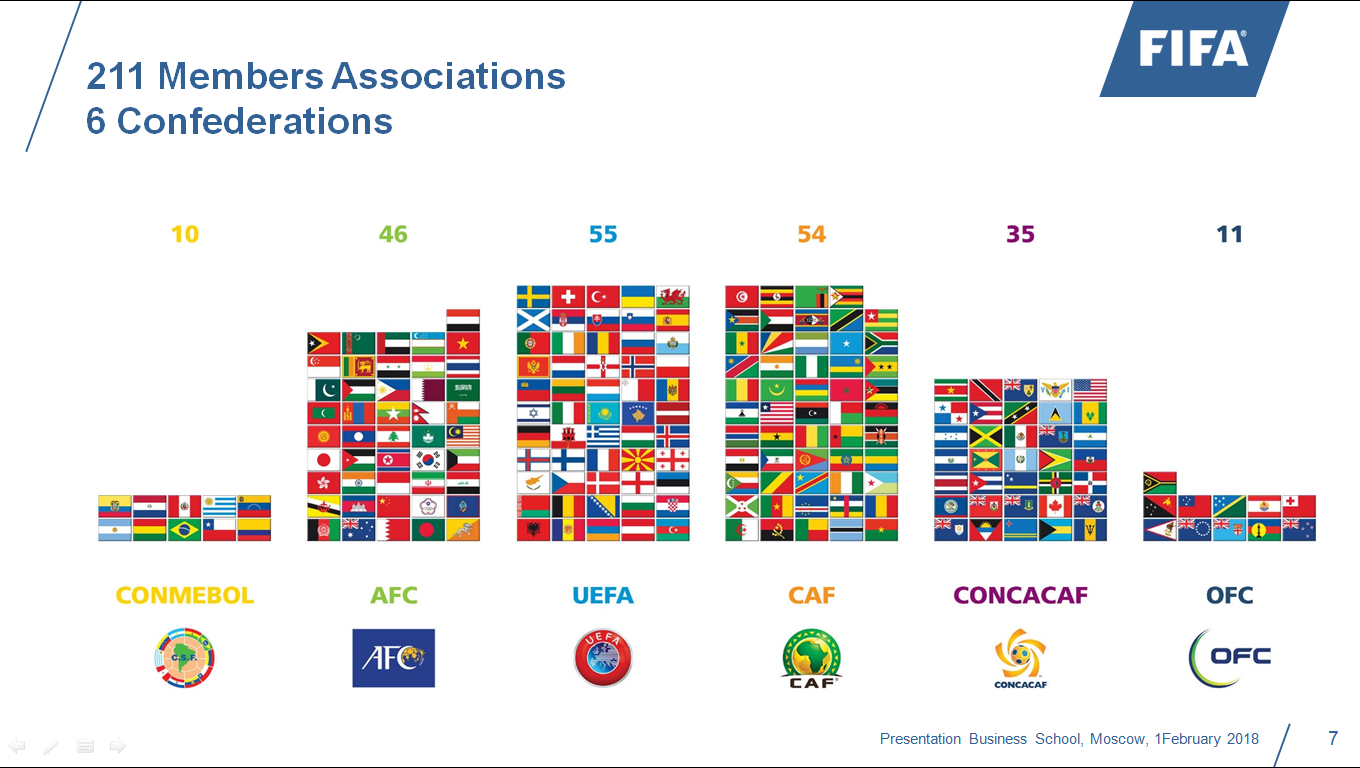 Сначала Крис Унгер рассказал об истории ФИФА, стартовавшей в 1904 году с объединения семи национальных федераций. За сто с лишним лет количество членов организации многократно увеличилось — на данный момент их насчитывается 211.