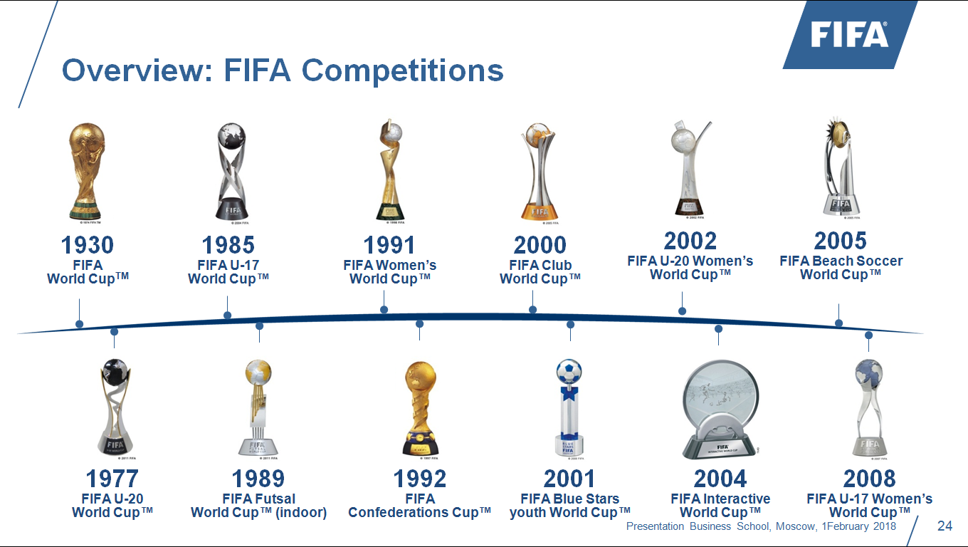 То же самое можно сказать и о международных турнирах, проводимых под эгидой ФИФА. В 1930 году первым — и на долгие годы единственным — таким соревнованием стал Чемпионат мира среди мужских команд, в настоящее же время ФИФА проводит в общей сложности 12 турниров для мужских и женских сборных в разных возрастных категориях.
