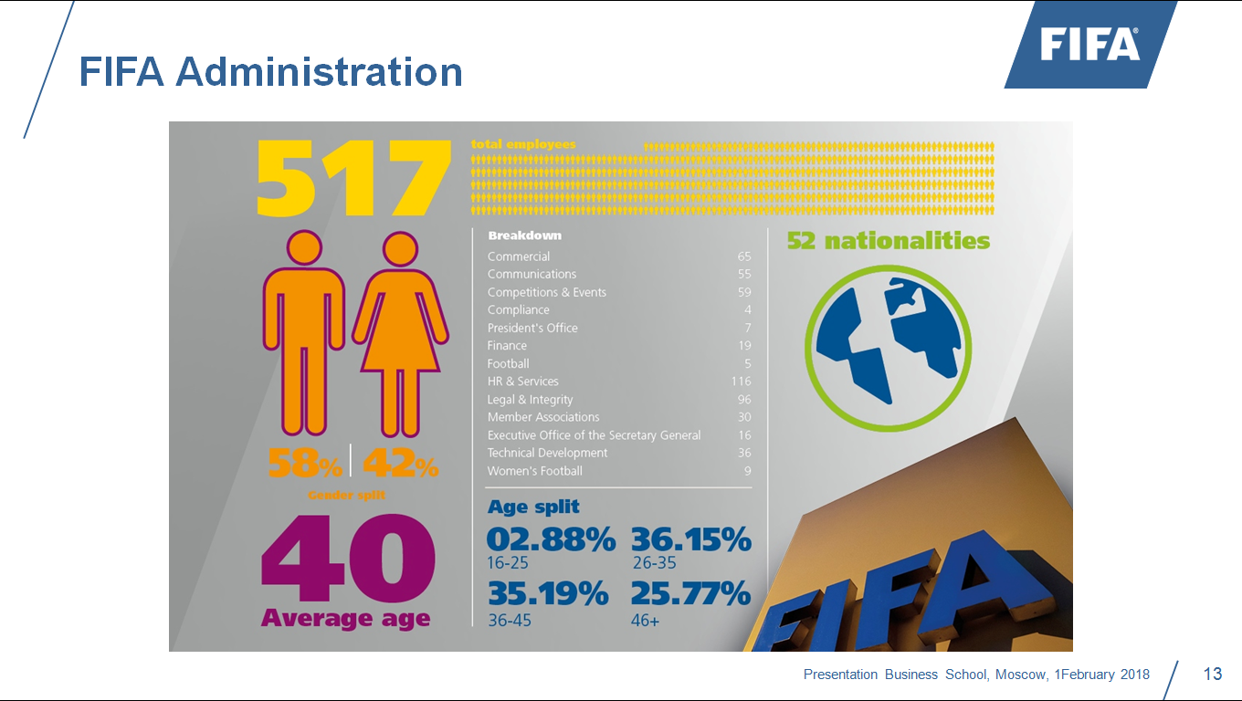 В штаб-квартире организации в Цюрихе сейчас работают 517 сотрудников, представляющие 52 страны. Среди них довольно много женщин — в общей сложности 48 процентов, а средний возраст чиновников организации не превышает 40 лет.