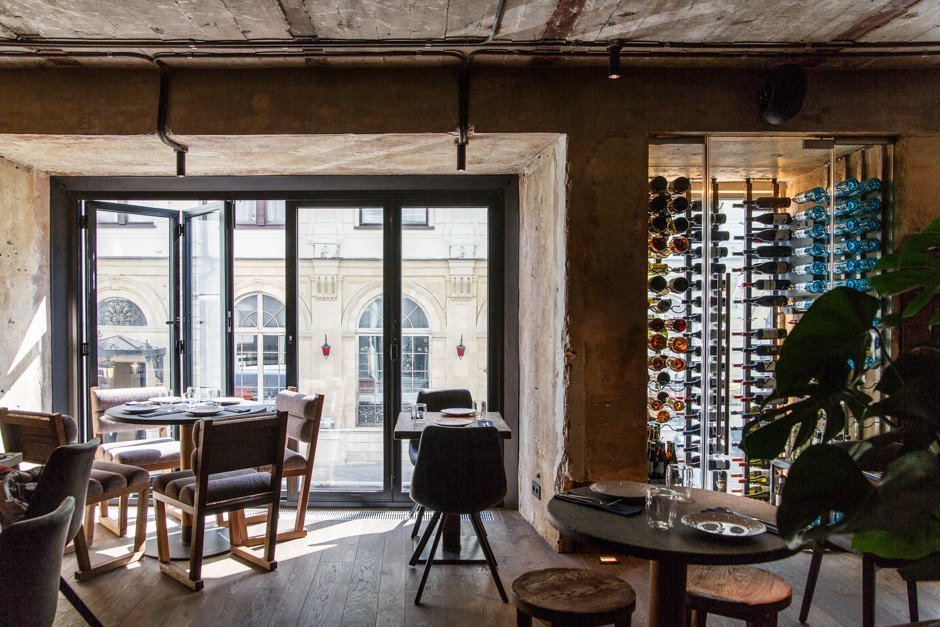 В общем, некий собирательный образ проектов Ильи Тютенкова, особенно когда попадаешь в уборную, где в темноте едва ориентируешься — любимый прием ресторатора. Местами проглядывается кирпич, цветовую палитру выбрали максимально нейтральную, от темно-серого до коричневого, по залу расставили растения, что немного освежает общий вид, но ощущение некой берлоги все же сохраняется.