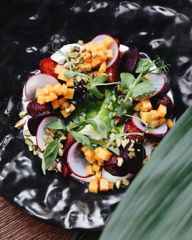 За кухню в Dante отвечает молодой шеф Игнат Куликов, который учился и работал в Новой Зеландии. Меню получилось небольшое, достаточно цельное, но вполне уже привычное для искушенной московской публики. Для начала предлагают буррату, два тартара (из тунца или говядины), слабосоленого лосося с трио пюре, суп из корня сельдерея, домашний сыр с ягодами, тайский салат и хрустящие баклажаны. Баклажаны, кстати, оказались совсем не хрустящими, щедро политыми очень душистым чесночным маслом, в сопровождении томатов и кусочков моцареллы.