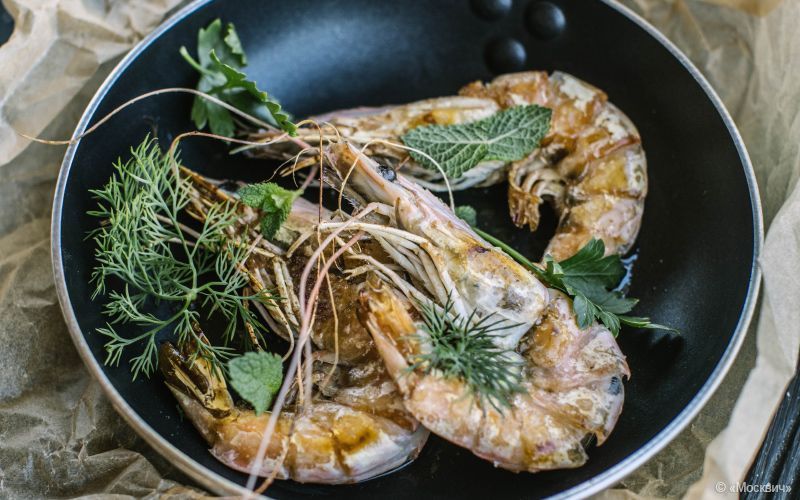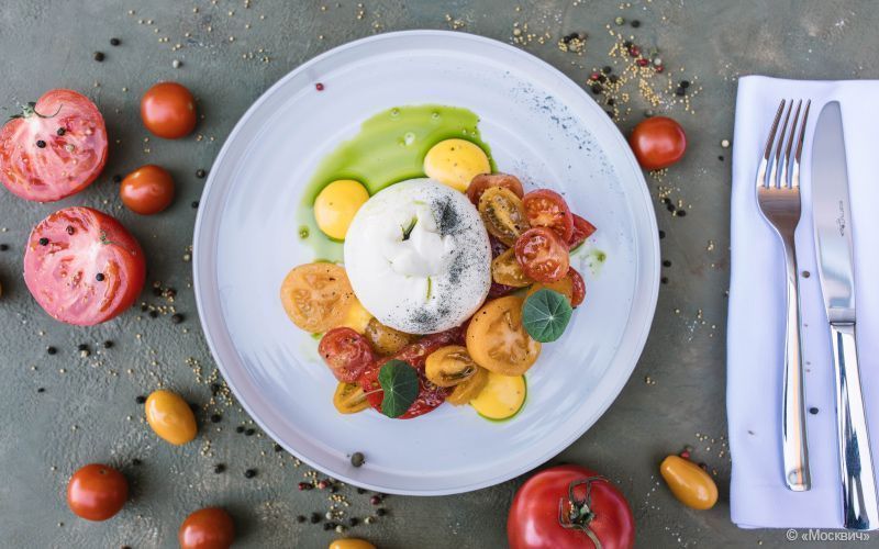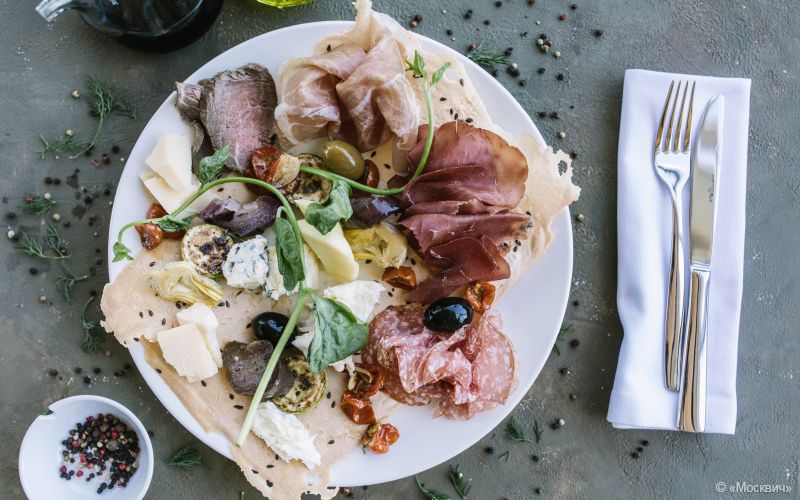 В меню «Москвича» — антипасто с четырьмя видами сыра, вялеными томатами, баклажанами и соусом песто; множество блюд на гриле, десерты, экспериментальные блюда с подмосковным ревенем.