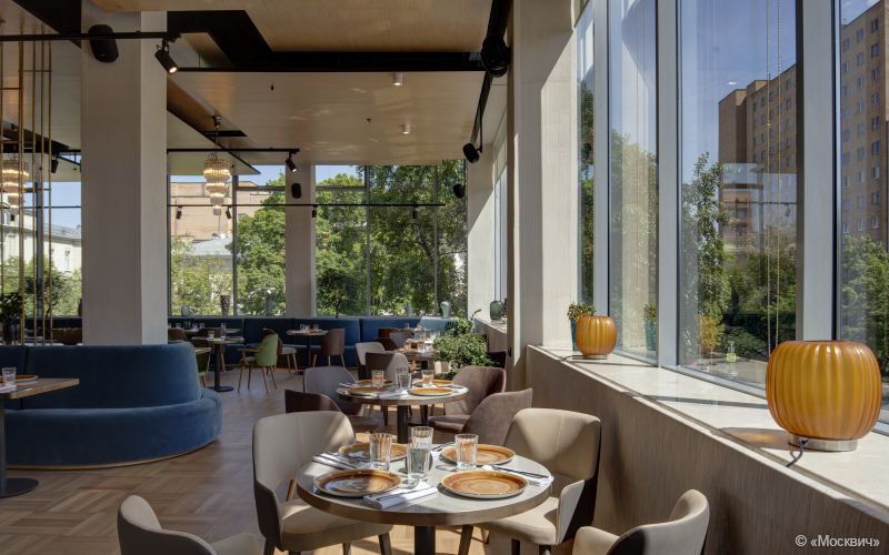 Из окон ресторана открывается панорамный вид на парк — бывшую подмосковную усадьбу князей Трубецких. Помимо основного зала на 100 посадочных мест, в «Москвиче» есть два VIP-зала, огромная детская комната и летняя веранда на балконе второго этажа.