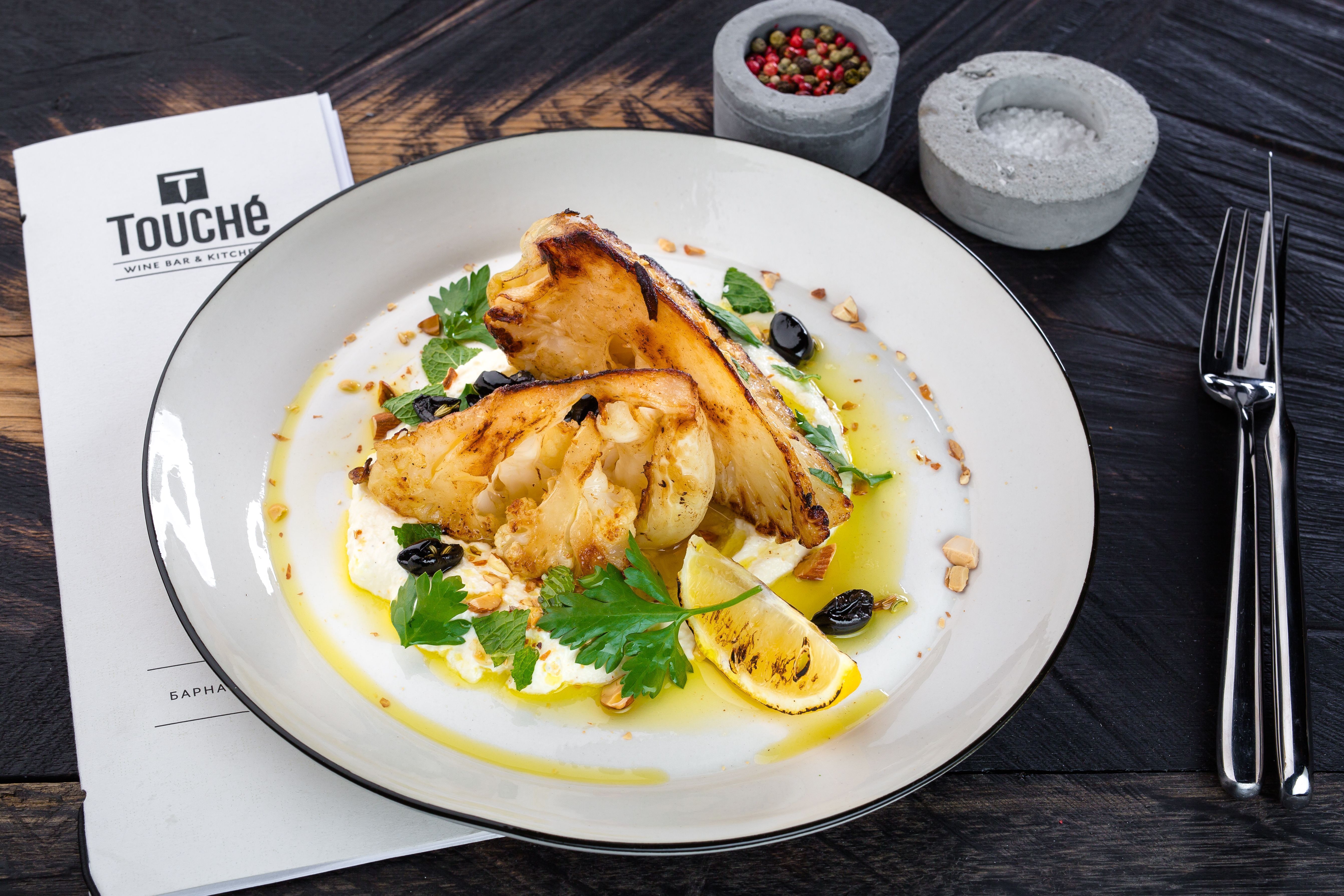 Все съестное в ресторане можно условно разделить на две части: блюда, рассчитанные на одного, — и многочисленные закуски для посиделок в компании. Среди позиций меню есть такие, как аранчини с крабом и айоли (430 руб.), домашние оливки, в которые добавляют маринованный виноград (450 руб.), или «Брокколи Touche'» (550 руб.) — интересная альтернатива «Цезарю» с беконом, сыром и заправкой из анчоусов.