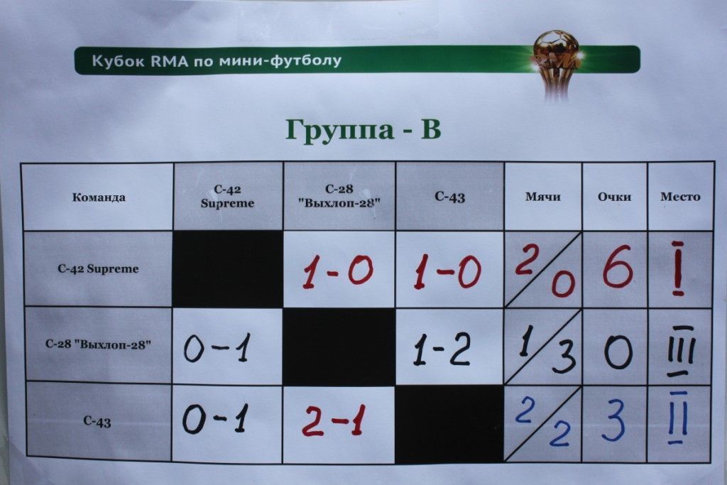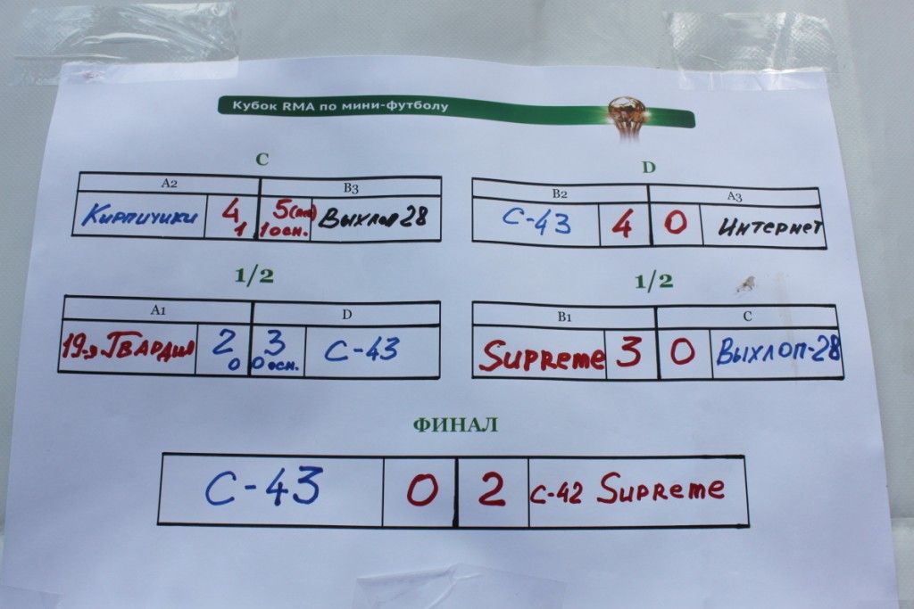 В минувшее воскресенье на стадионе «Метеор» прошел одиннадцатый по счету турнир на Кубок бизнес-школы RMA по мини-футболу, приуроченный, как обычно, к окончанию учебного года. Его победителем стала команда Supreme, составленная из выпускников учебной группы «С-42» факультета «Менеджмент в игровых видах спорта». Лучшим игроком турнира был признан нападающий команды-финалиста «С-43» Александр Головков.