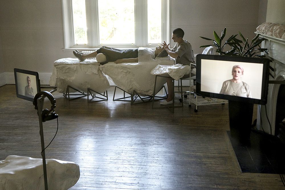 Пространство, в котором проводятся процедуры, наполнено обломками гигантской головы разбитой греческой скульптуры. Я работала совместно с Александром Кутовым, потрясающим украинским художником, потому что у меня не было опыта создания скульптурной инсталляции. На кушетке из сломанных скульптурных элементов два дня в неделю по предварительной записи исполнитель — нечто среднее между косметологом и реставратором — проводит особую процедуру: в некотором роде вы становитесь произведением искусства, которое он реставрирует. Во время процедуры косметологи произносят текст, написанный ливерпульским писателем Дэвидом Макдермоттом. Это истории об исчезнувших и поврежденных произведениях искусства, а также о синестезии зеркального прикосновения — крайней форме синестезии, когда люди ощущают боль, видя, как причиняют боль другим. Я узнала об этом нейробиологическом феномене из разговора с профессором психологического факультета Голдсмитс-колледжа Майклом Бэнисси. У некоторых людей, по-видимому, подобная синестезия проявляется даже по отношению к предметам, и это заставило меня задуматься о том, что такой человек почувствовал бы, увидев, например, как режут картину.