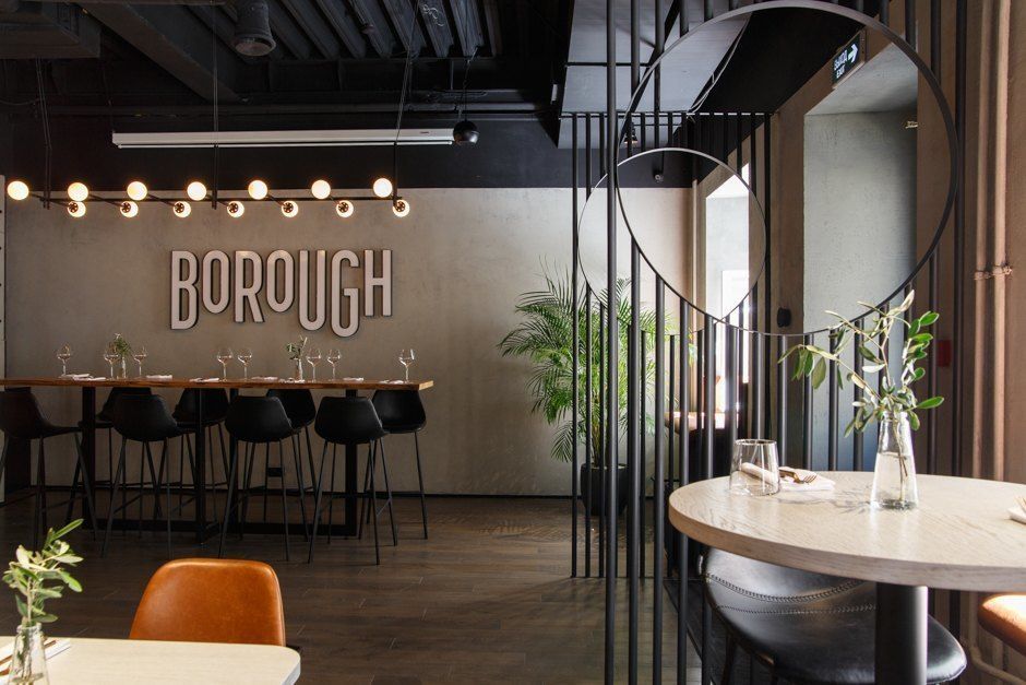От пышных интерьеров предыдущих владельцев не оставили ничего — в Borough царит минимализм и чистота форм. Оформлять пространство доверили дизайнеру Екатерине Федоровой, и раклет-бар стал ее первым проектом в ресторанной сфере. Собственно, некая осторожность чувствуется, и Borough получился очень спокойным и выдержанным, но при этом совсем не строгим. Цветовую гамму выбрали темную: стены оставили гладким бетоном, потолок выкрасили в черный, мебель подобрали из металла и благородной коричневой кожи. Отдельной похвалой стоит отметить освещение, с ним здесь действительно хорошо поработали — общее пространство погружено в полутьму, а столы щедро подсвечены, что позволяет видеть не только собеседника, но и еду в тарелке.