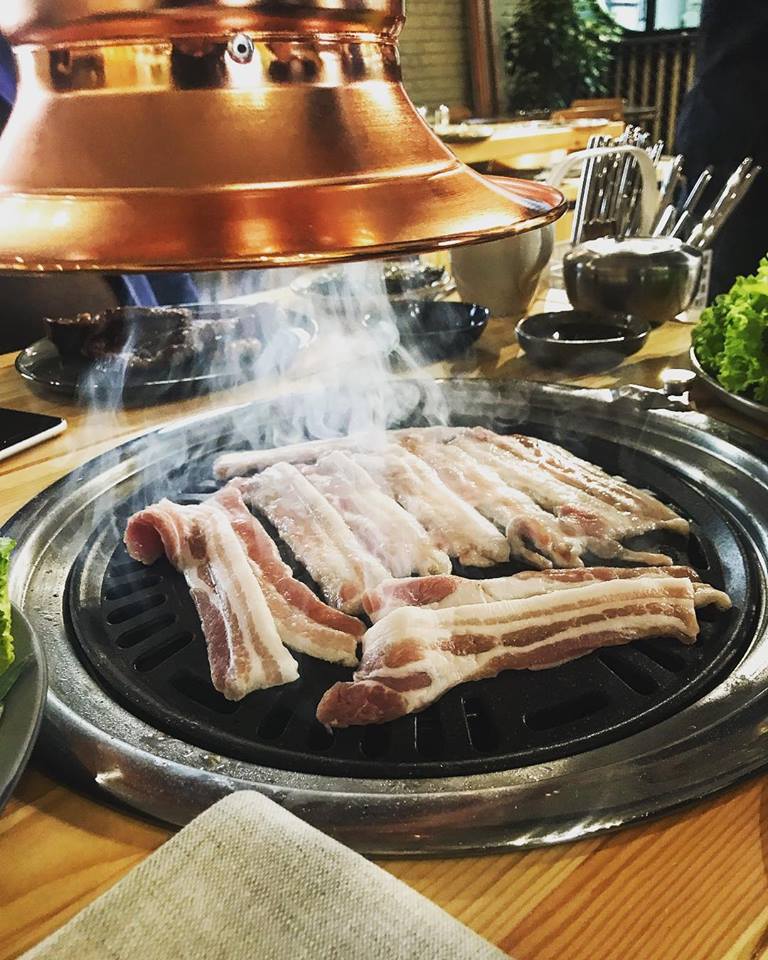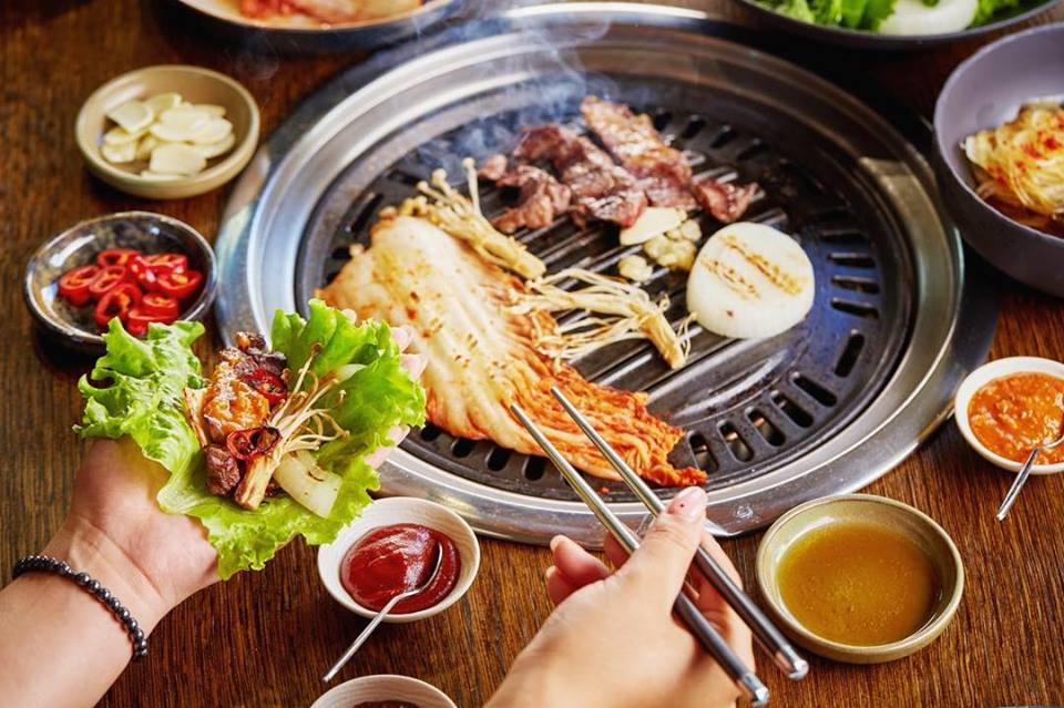 Жарить предлагают мраморную вырезку, маринованный рибай, говяжьи ребра или свиную грудинку. К мясу подают традиционные корейские соусы кочудян, самдян и твиндян, жареные нори, кимчи и грибы эноки. Гости могут пожарить мясо самостоятельно либо это сделает официант.