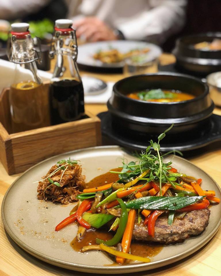 Концепция выстроена вокруг корейского гриля или «пулькоги», который готовится прямо на столе у гостей. В ресторане восемь столов со встроенным грилем и вытяжкой над ним.