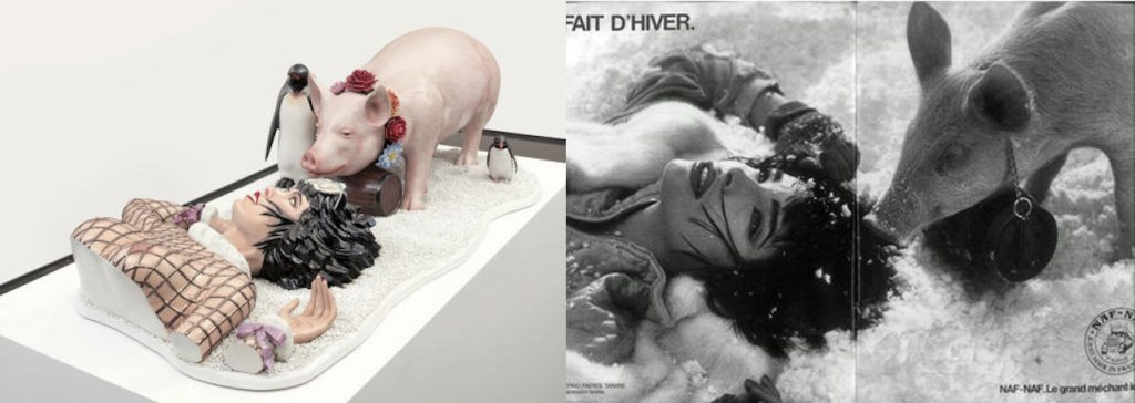Согласно его информации, в музее Центр Помпиду в 2014 году прошла выставка, на которой художник Кунс представил пластиковую скульптуру поросенка, пингвина и женщины, которая внешне напоминала рекламу зимней коллекции 1985 года бренда Naf Naf.
