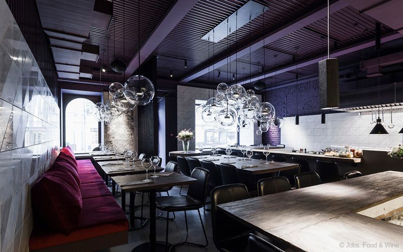 В Jobs. Food & Wine 30 посадочных мест. Интерьер многофункциональный: две контактные стойки, коммунальный стол для больших компаний, широкие подоконники и столики для двоих. Кухня открытая, оборудован шеф-тейбл.