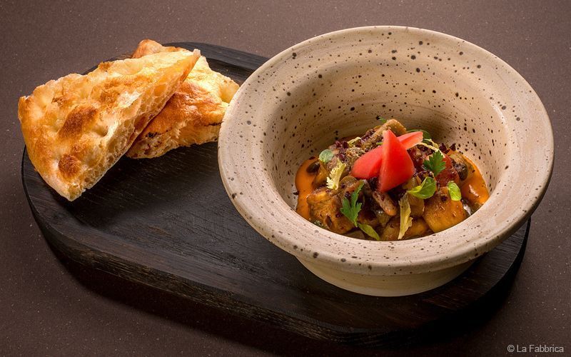 Среди закусок в La Fabbrica — вителло тонато (480 рублей), карпаччо (490 рублей) и тартар (550 рублей); в разделе домашней пасты — тальятелле с копченым лососем (570 рублей), лазанья (550 рублей) и равиоли с козленком (530 руб).