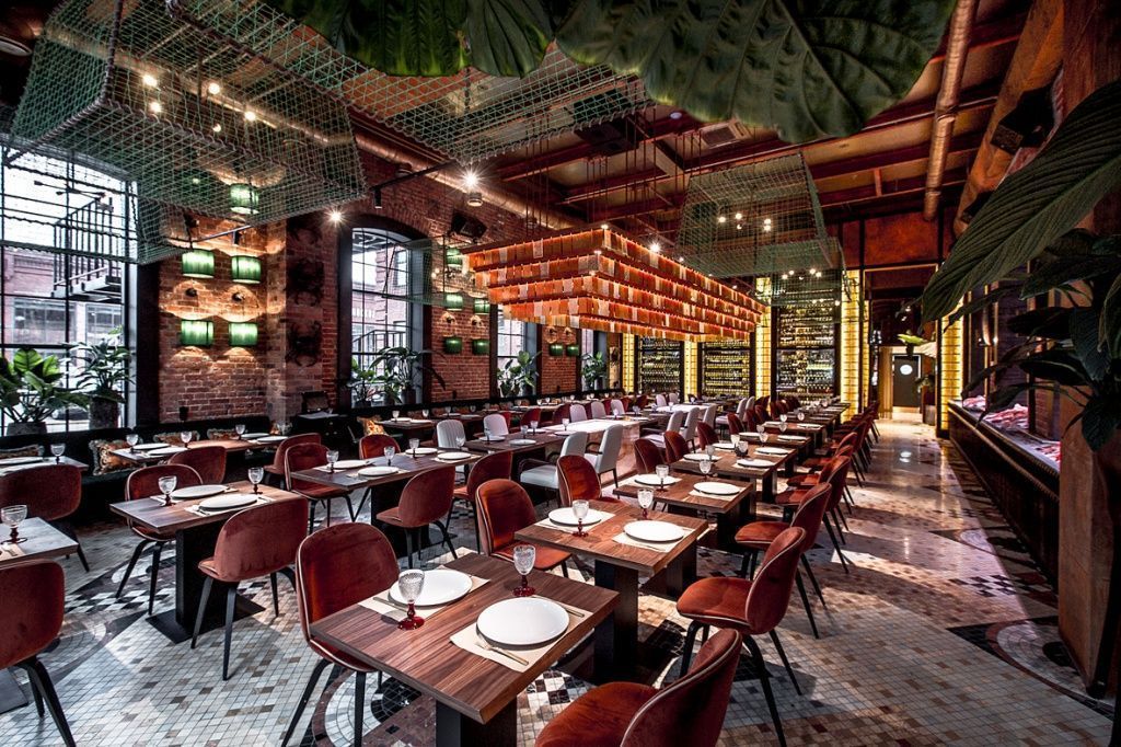 С лофтового потолка свисают роскошные люстры из синего хрусталя, а в соседнем зале плафоны выполнены в виде промышленных краболовок. Проходы между залами разделены золотистыми металлически шторами, напоминающими рыболовные сети. Столы на шесть, четыре и две персоны расставлены параллельными рядами, так называемой казарменной рассадкой, популярной в больших ресторанах США и Европы