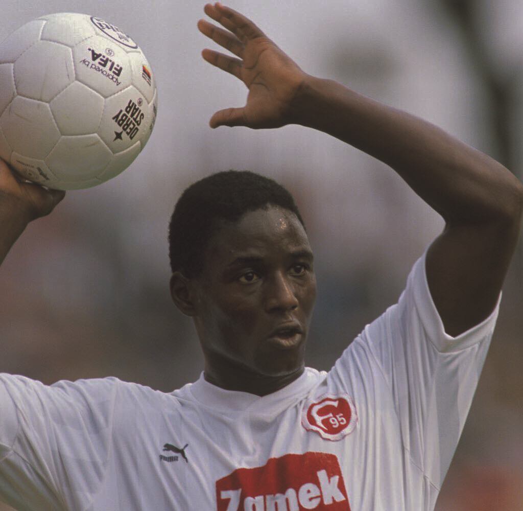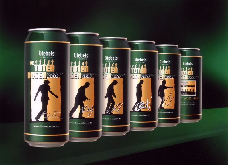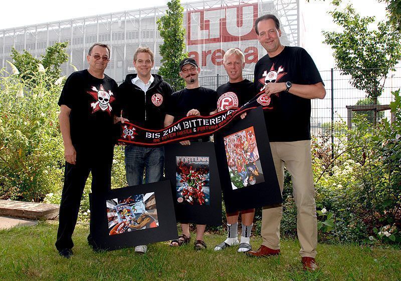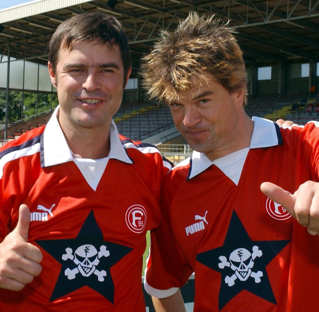 На фото 1 — вокалист Die Toten Hosen Андреас «Кампино» Фреге (справа) в игровой футболке «Фортуны» с логотипом группы на груди. Снимок сделан накануне сезона 2001/2002, по итогам которого клуб вылетел из Региональной лиги Норд в Оберлигу Нордрейн. Одновременно Die Toten Hosen, продавшие под 20 миллионов дисков и у себя на родине пользующиеся гораздо большей популярностью, чем их любимый клуб, инициировали выпуск совместной с «Фортуной» линейки мерча (на фото 2), реализация которого помогла команде хоть как-то залатать зияющие в ее бюджете дыры, и подписали контракт с местной пивоварней Diebels: часть выручки с продаж именного пива Die Toten Hosen (на фото 3) пошла на финансирование молодежного состава «Фортуны». Впрочем, этим перечень благодеяний, оказанных великодушными панками главной команде родного города не исчерпывается: еще за 13 лет до описываемых событий, в 1989-м, Die Toten Hosen пожертвовали «Фортуне» 200 тысяч марок, которые были потрачены на покупку защитника сборной Ганы Энтони Баффо (на фото 4), помогшего команде победить в турнире второй Бундеслиги и ненадолго подняться в первую. Когда без малого тридцать лет спустя клуб вновь продрался в элиту, Кампино с коллегами отпраздновали это событие грандиозным бесплатным концертом на главной площади Дюссельдорфа