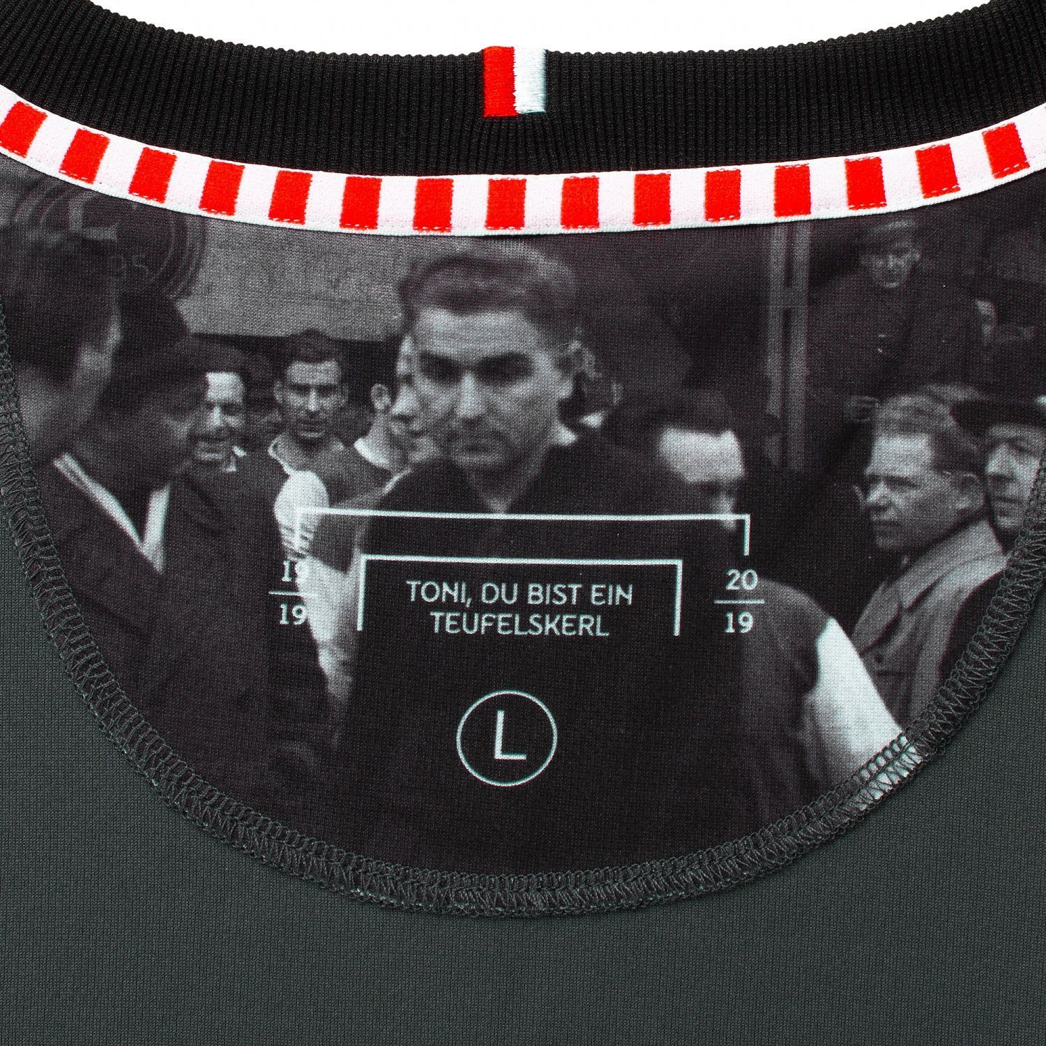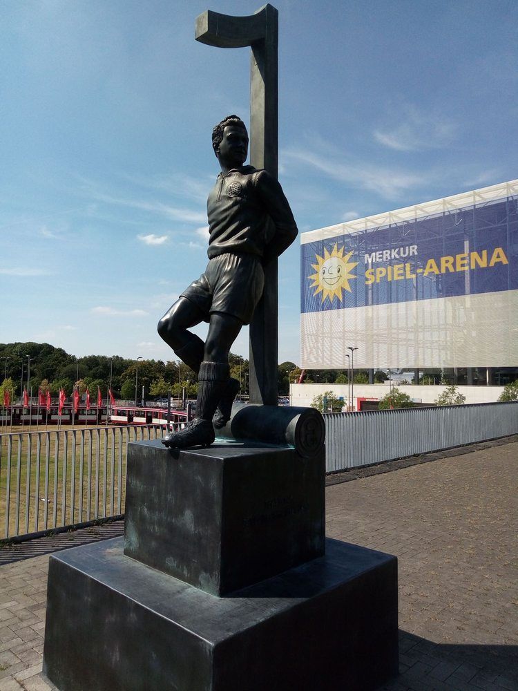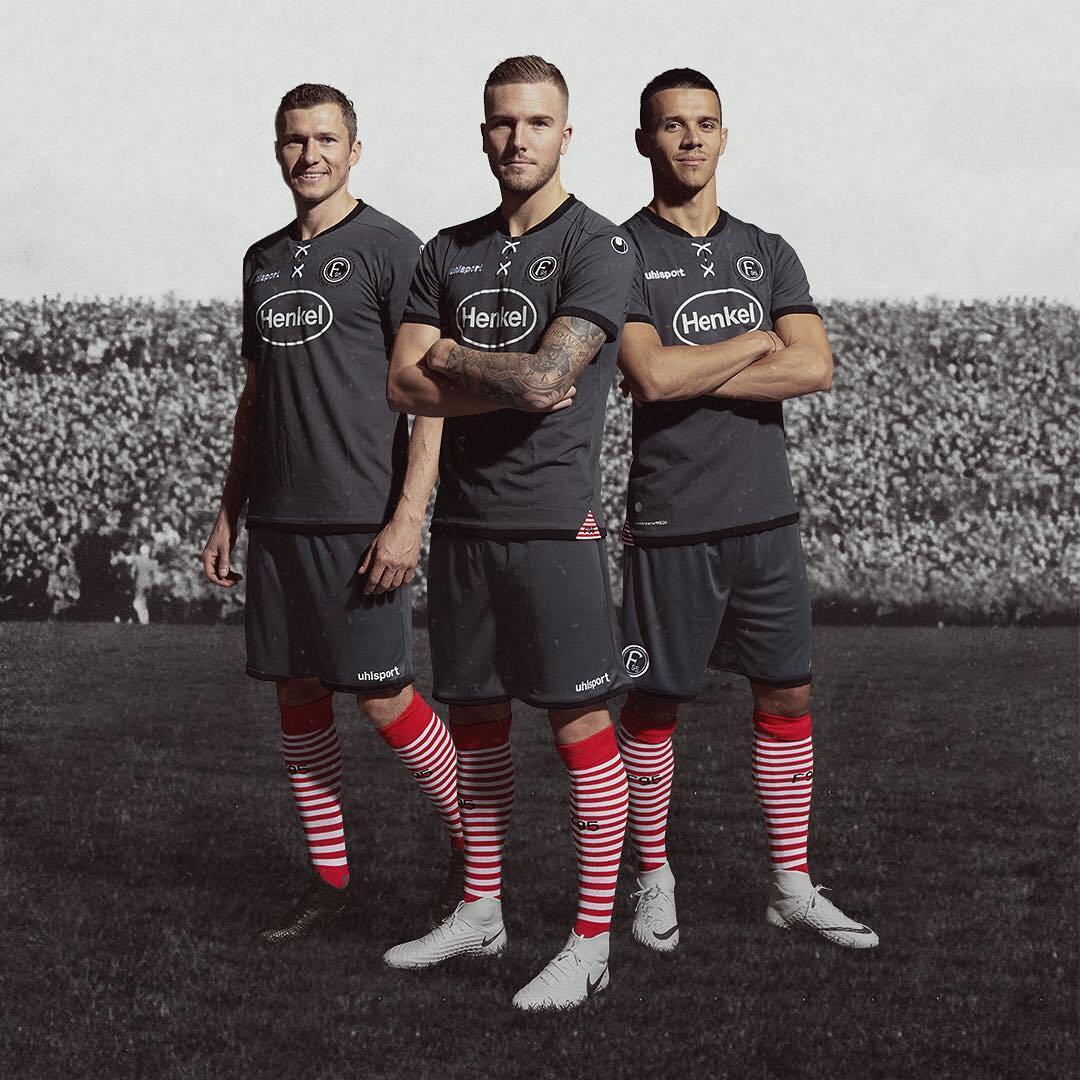 Один из самых ярких примеров сохранения «Фортуной» исторической памяти и приверженности традициям. Резервный (четвертый) комплект формы клуба на сезон 2018/19 посвящен 100-летию со дня рождения человека, изображение которого нанесено на внутреннюю тыльную часть воротника футболки, и сопровождено подписью «Тони, ты — молодчик». Вратарь Тони Турек играл за Дюссельдорф с 1950 по 1956 годы, и в 1954-м, будучи основным голкипером сборной Германии, помог ей завоевать ее первый мировой титул. На фото 3 — памятник герою на домашнем стадионе «Фортуны» Merkur Spiel Arena