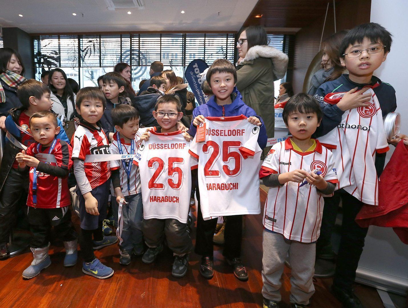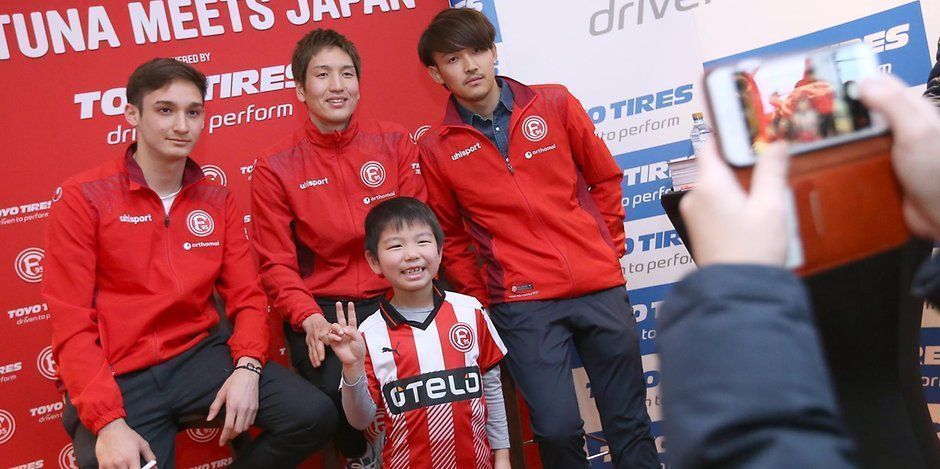 Февраль 2018 года. Дюссельдорф. Джастин Тосики Кинзо, Гэнки Харагути, Такаси Усами (слева направо) и их поклонники во время автограф- и фото-сессии, организованной «Фортуной» и Toyo Tyres