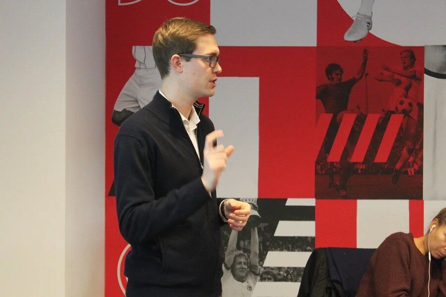 Тобиас Штайнфорт во время мастер-класса для студентов факультета «Менеджмент в игровых видах спорта» и других участников стажировки в Германии