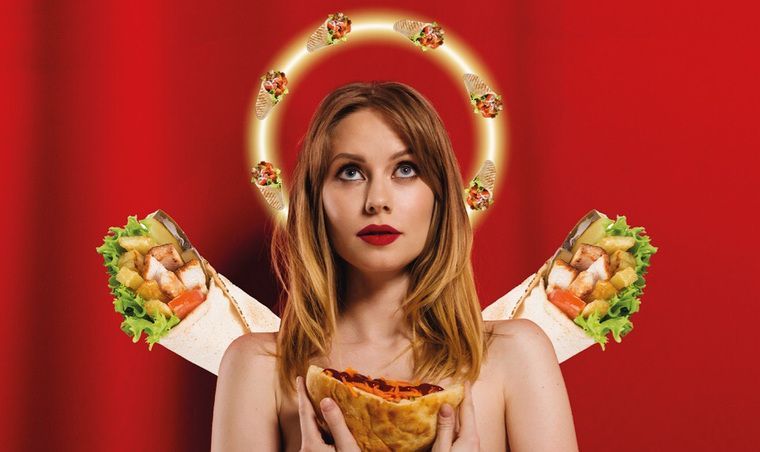 В критикуемой рекламе использовались христианские образы. На фотографии полуобнаженная модель в образе мученицы признается в любви «божественной шаурме».