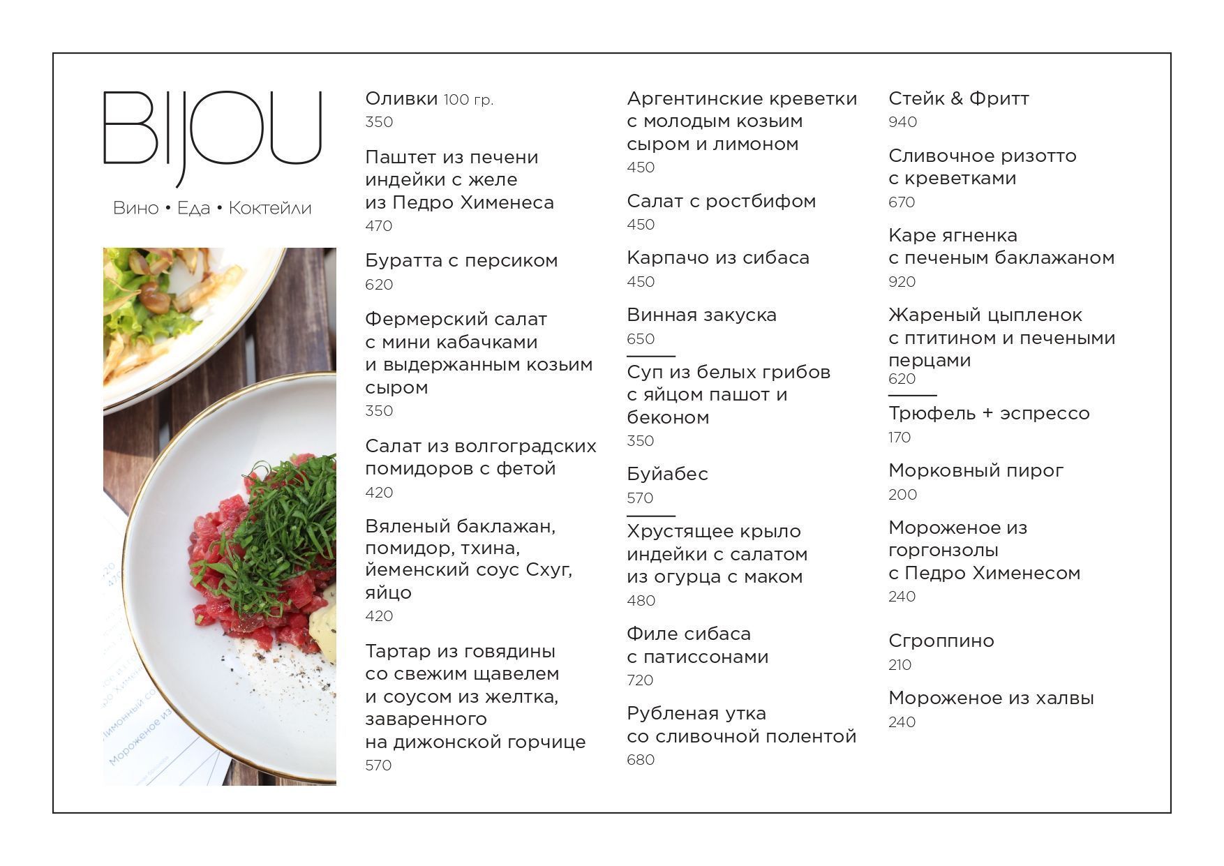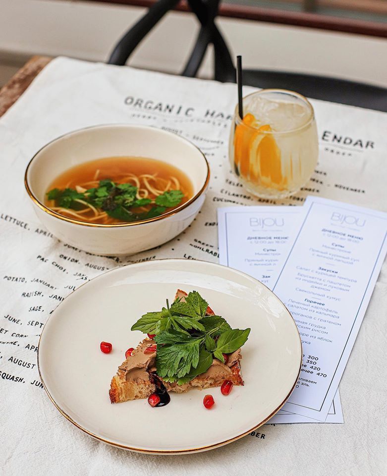 «Bijou» с французского переводится как драгоценность. Есть одноименный коктейль, который состоит из трех ингредиентов: джин как прозрачный бриллиант, шартрез как зеленый изумруд, красный вермут как красный рубин. Это абсолютно разные напитки, но чудесно сочетаются вместе. Это же можно сказать и про нас троих — мы очень разные, но нас объединяет любовь к еде, хорошим напиткам, беседам и танцам по настроению. Так и получается, что у нас вкусная еда, интересные коктейли, классная атмосфера, и вечеринки по пятницам и субботам.