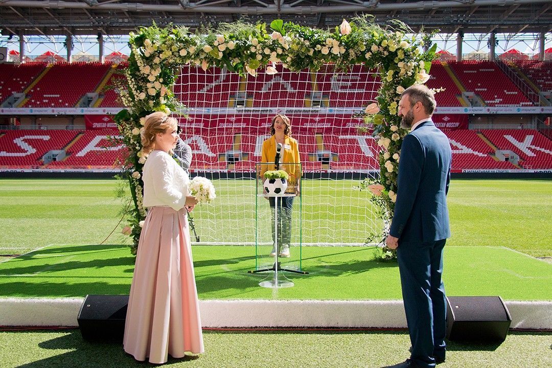 В последнее время очень большой популярностью пользуется такое наше предложение как «Свадьба на стадионе». В мае текущего года эта программа стартовала, и сразу вокруг нее возник ажиотаж — в первый же день работы арены в качестве своего рода филиала Тушинского ЗАГСа, здесь состоялись сразу 24 церемонии бракосочетания, а всего с тех пор их прошло уже более 200.