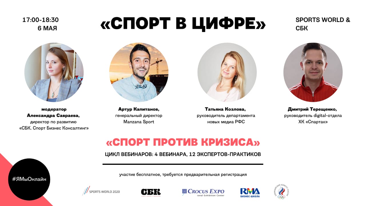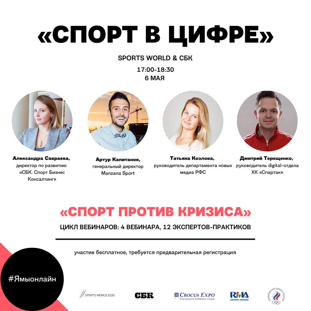 6 мая международная выставка Sports World и факультет «Менеджмент в игровых видах спорта» проведут первый семинар о спортивном бизнесе во время пандемии коронавируса из цикла «Спорт против кризиса». Вебинар «Спорт в цифре» будет посвящен работе с болельщиками в период отмены всех соревнований. Начало в в 17.00.