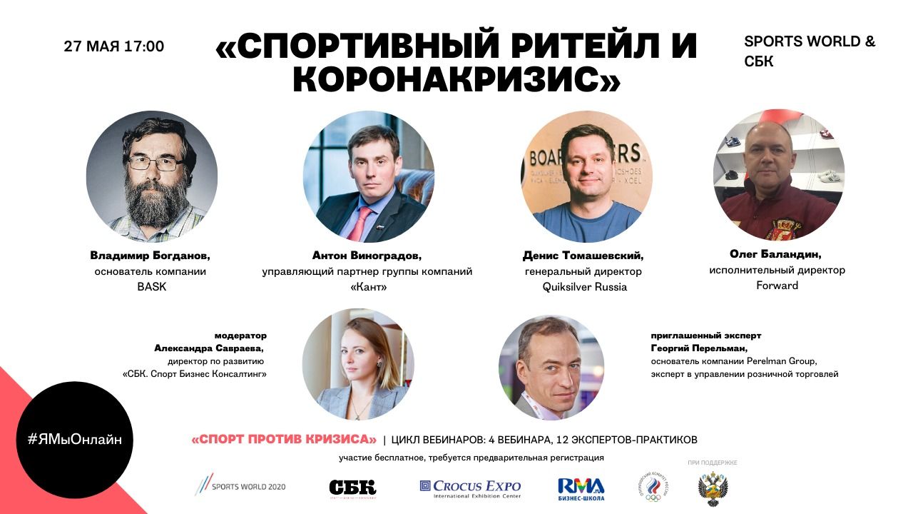 27 мая международная выставка Sports World, издание «Спорт Бизнес Консалтинг» и факультет «Менеджмент в игровых видах спорта» при поддержке Министерства спорта Российской Федерации и Олимпийского комитета России проведут четвертый семинар о спортивном бизнесе во время пандемии из цикла «Спорт против кризиса». Вебинар «Спортивный ритейл и коронакризис» пройдет 27 мая в 17.00.