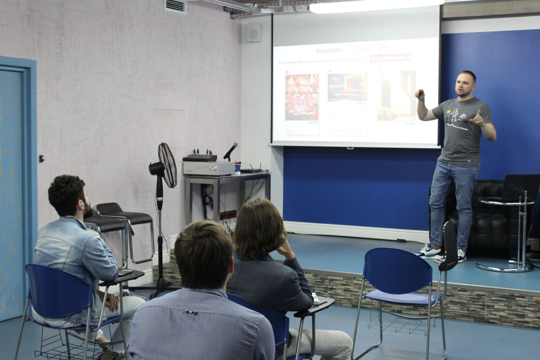 Евгений проводит для студентов RMA одно из занятий «Лаборатории ПФК ЦСКА», рассказывая об SMM