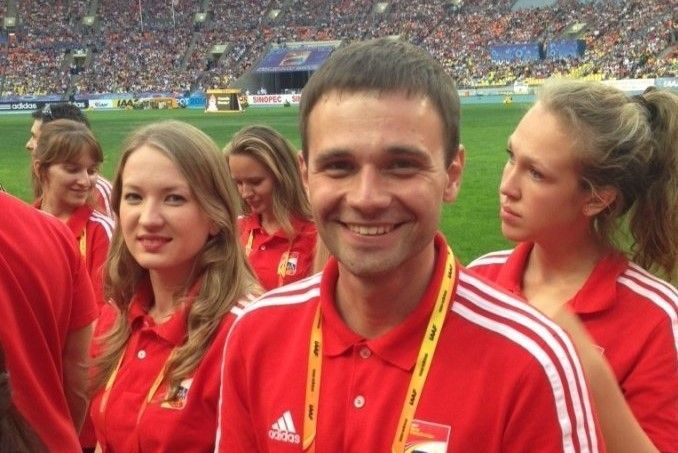 Евгений во время стажировки на Чемпионате мира ИААФ по легкой атлетике
