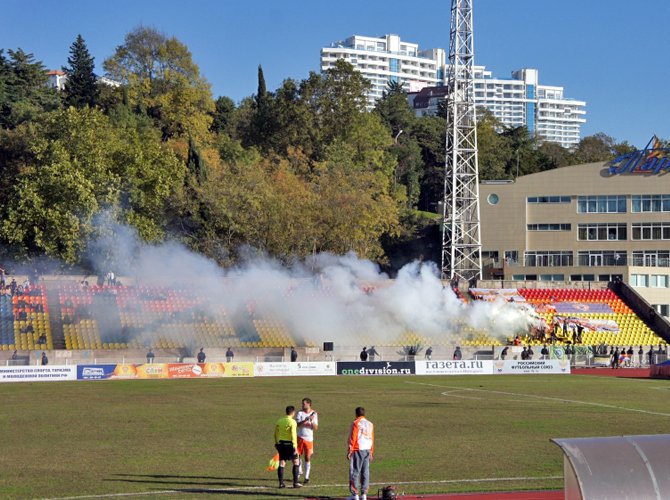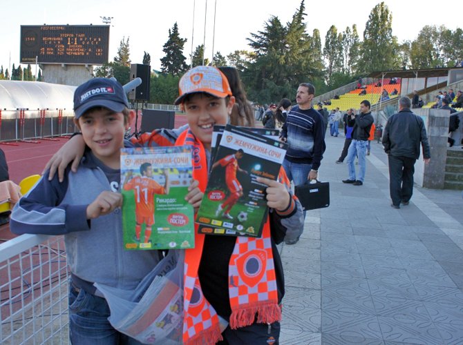 Аренда стадиона на одну игру обходится сочинскому клубу в 200 тысяч рублей. По словам директора по маркетингу "Жемчужины" Андрея Малосолова, эта сумма спокойно покрывается доходом от продажи билетов, бесплатной раздачей которых в клубе не злоупотребляют. На последний матч сезона 10-тысячник заполняется, наверное, наполовину, бросается в глаза большое количество детей (такого в Москве точно нигде не встретишь) - одни сидят с родителями на трибунах, другие нарезают круги вокруг поля.
