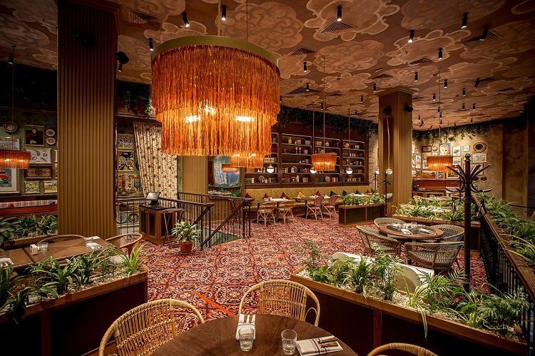 На втором расположено несколько зон, задуманных для разных компаний. Об итальянских двориках напоминают кованые ограждения и большое дерево, прорастающее сквозь стол.