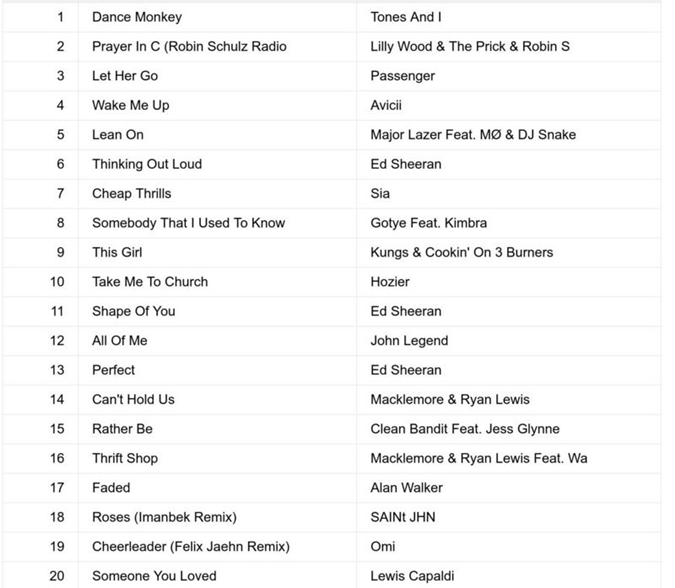 Dance Monkey, который певица написала, вдохновившись своим опытом уличной игры ради денег в Байрон-Бей, искали через Shazam 33.6 миллиона раз. В Youtube этот клип посмотрели почти полтора миллиарда раз.