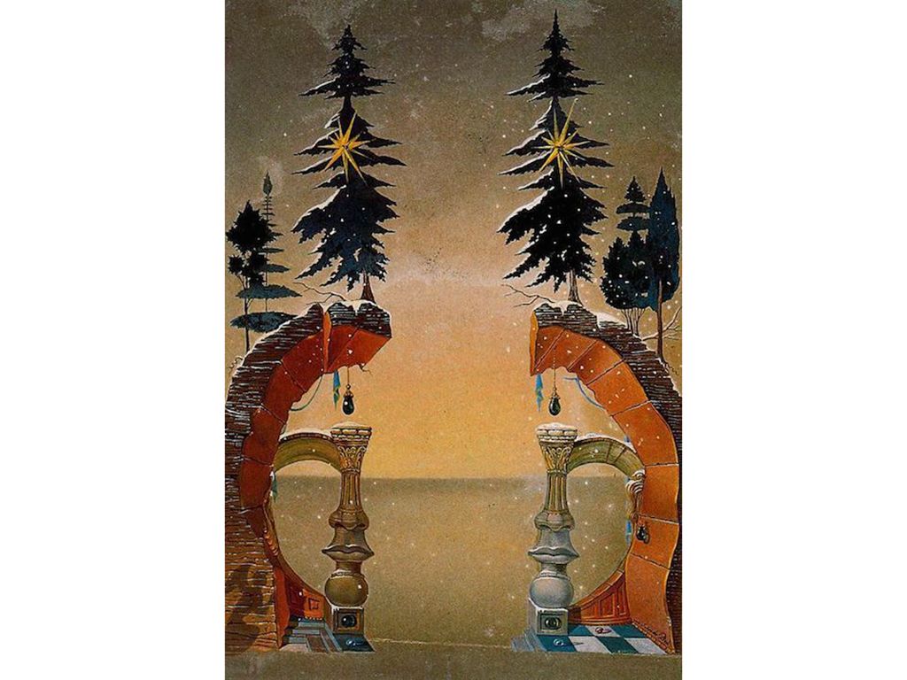 В 1946 году Сальвадор Дали создал эскиз рождественской обложки журнала Vogue, а несколькими годами позже — дизайн 19 рождественских открыток для крупной барселонской компании. В работах Дали не встретить привычных для рождественского сюжета изображений сцен в яслях или поклонения волхвов, да и по обложке для Vogue сложно сразу понять основную тему. Пустынный пейзаж и очертания женских лиц, проглядывающие в архитектурных деталях, типичны для большинства его работ. Пожалуй, о празднике напоминают лишь две пушистые ели с сияющими звездами в центре.