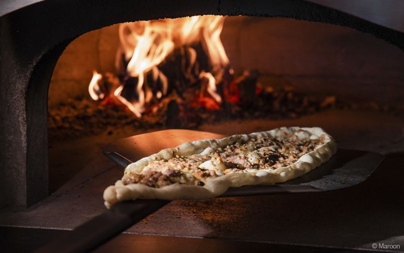 Входя в ресторан Maroon, вы попадаете на восточный базар, где отовсюду веет особой эстетикой, атмосферой и философией. У самых дверей расположилась открытая кухня с мангалом, дровяными печами и саджем, где гость может наблюдать за приготовлением блюд.