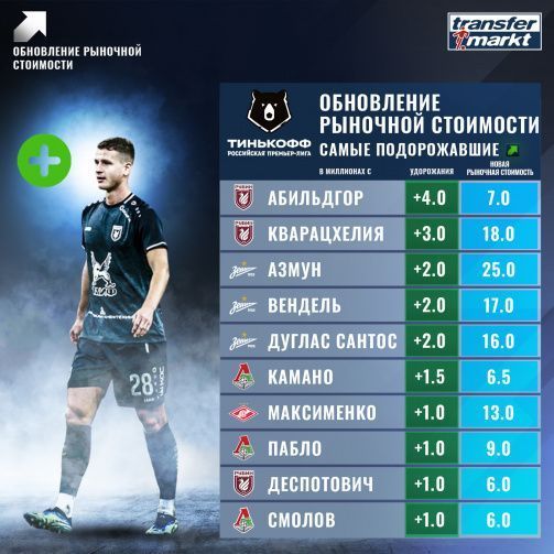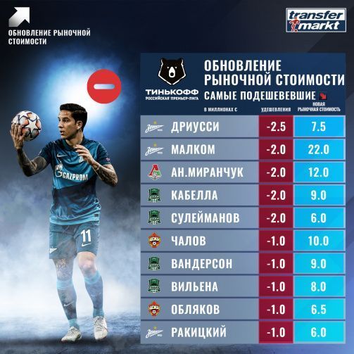 Больше всего понизилась стоимость нападающего «Зенита» Себастьяна Дриусси – на € 2,5 млн, теперь аргентинец стоит € 7,5 млн. На € 2 млн снижена стоимость Малкома («Зенит»), Реми Кабелла, Магомеда-Шапи Сулейманова (оба – «Краснодар») и Антона Миранчука («Локомотив»).
