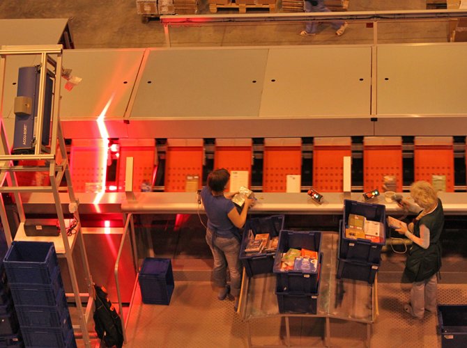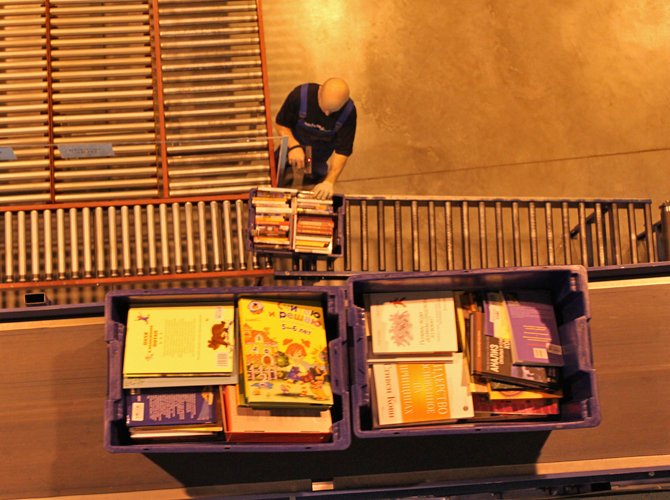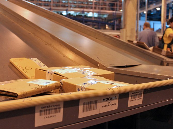 Функционирование этой машины завязано вокруг штрих-кодов. Пара считываний, и обезличенный товар попадает в корзину, соответствующую заказу. Когда в корзине собирается весь заказ, загорается лампочка, и работник OZON.ru перемещает ее в зону упаковки. Упакованный товар сортируется по географическому принципу, после чего отправляется к заказчику.