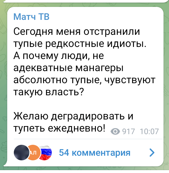 Новость в Telegram-канале Матч ТВ оказалась представлена постом «уволенного сотрудника» — он жаловался на «неадекватных манагеров, тупых и редкостных идиотов».
