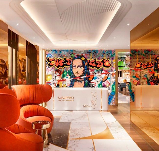 В оформлении ресторана заметен ироничный и постмодернистский подход. Символ ресторана – кролик с пивным бокалом в одной руке и мороженым в другой – отсылает к скульптурам американского художника Джеффа Кунса.
