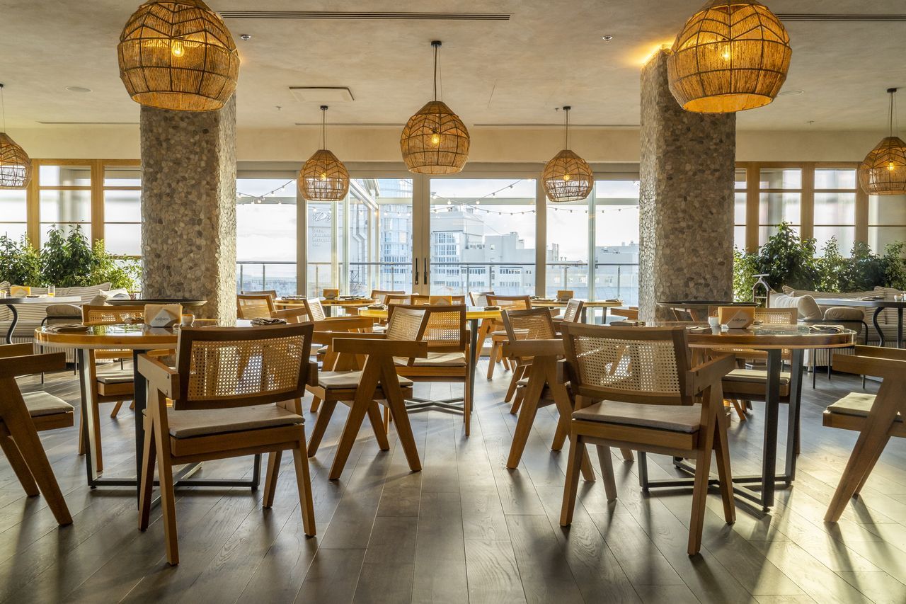 Главным украшением ресторана стали виды Воронежа, открывающиеся с высоты седьмого этажа. Дизайнеры стилистически объединили зал с террасой и стерли грань между пространствами с помощью раздвижных перегородок.