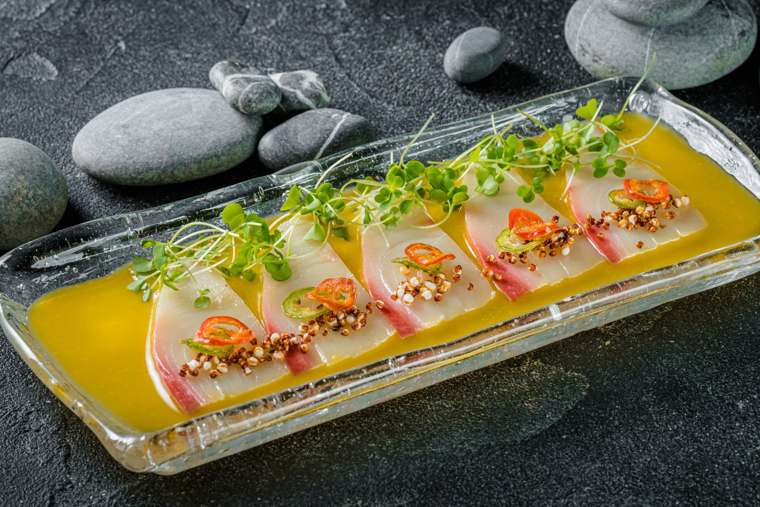 Основную часть меню составляют блюда в уникальном стиле никкей — микс перуанской и японской кухни с большим количеством авторских блюд от бренд-шефа Сантьяго Торрихоса.