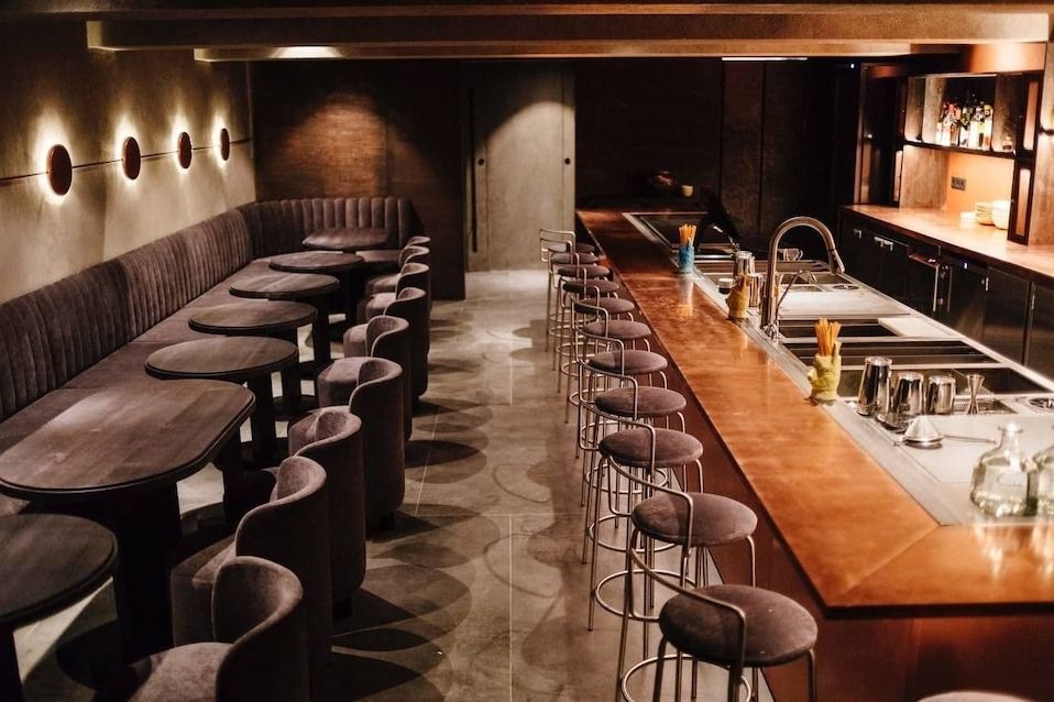 Пространство поделено на два зала. Первый — со стенами цвета охры и широкой барной стойкой, за которой разместились бартендеры и зона для повара. Второй, «красный» — с открытой кухней, за которой можно сидеть, и еще 12 мест за деревянными столами.