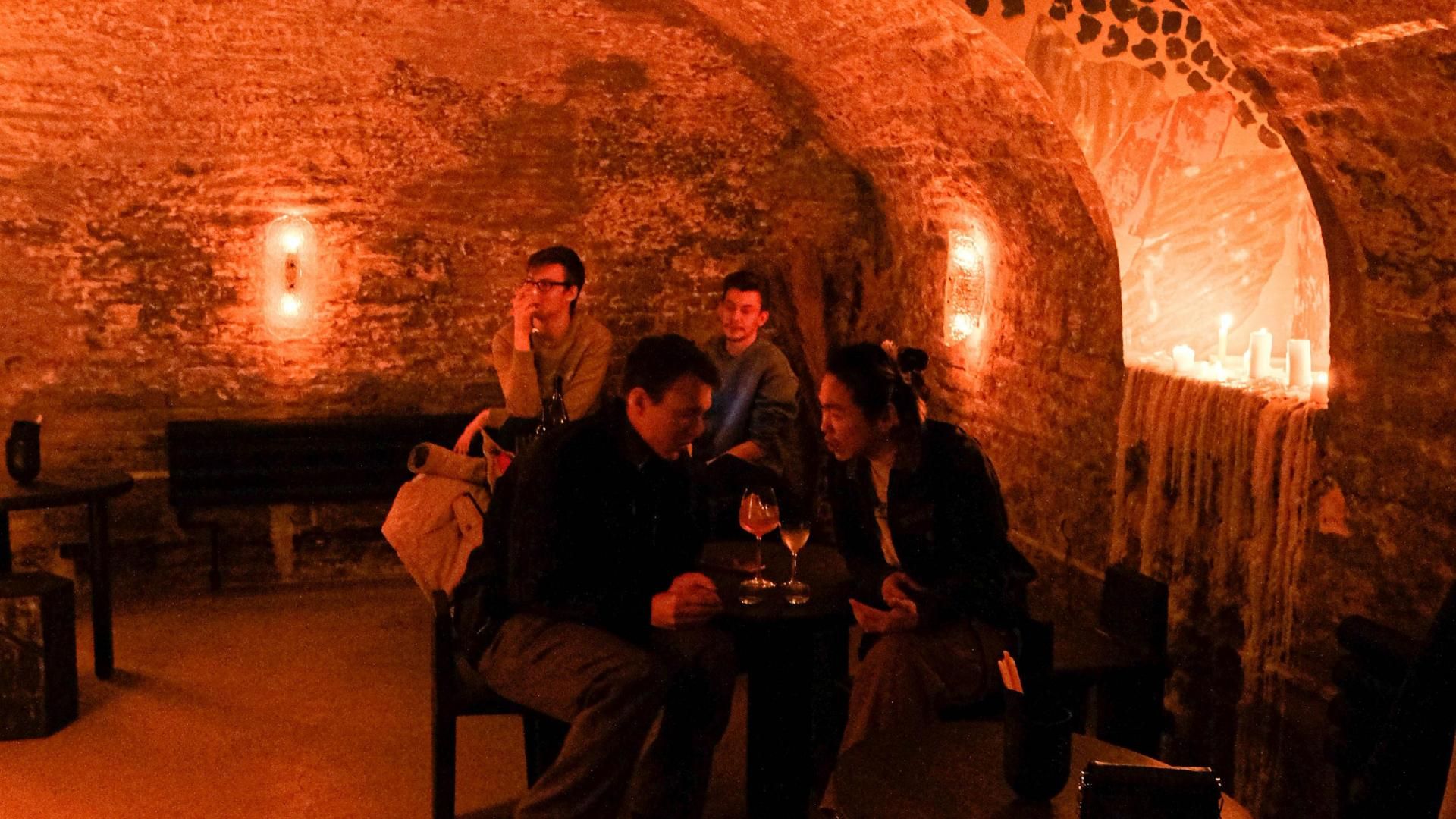 Вход — слева от «Охотки», вывески нет, ищите окно с телевизором.