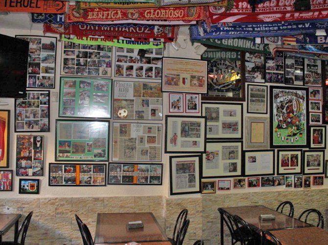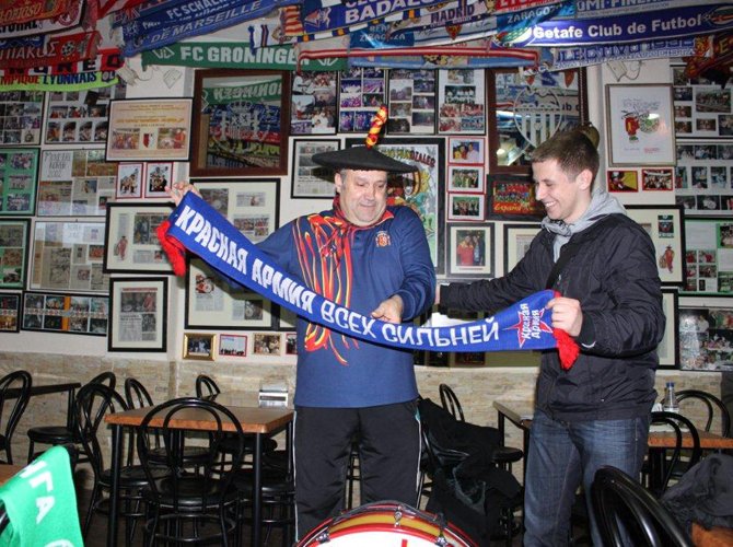 Раньше все-таки в этом смысле было лучше, спокойнее. Я с этим по мере сил борюсь, видишь, что у меня на барабане написано? «Спорту — да, насилию — нет». И, кстати, вот в этот бар может любой болельщик придти, любой команды.